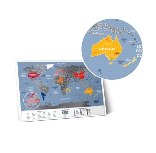 Mapa je upakovana u prelepu tubu, odštampana na sjajnom laminiranom papiru. Da ne bi mapa bila dosadna što se tiče velikih teritorija, znajte da su one podeljene na regije, države i provincije. Ipak kada posetite Moskvu, to ne znači da ste obišli celu Rusiju. Isto važi i za Sjedinjene Američke Države. Nije Nju Jork cela Amerika. Ovde varanja nema. Svaka mapa sadrži i 15.stvari koje mora da uradi svaki svetski putnik.