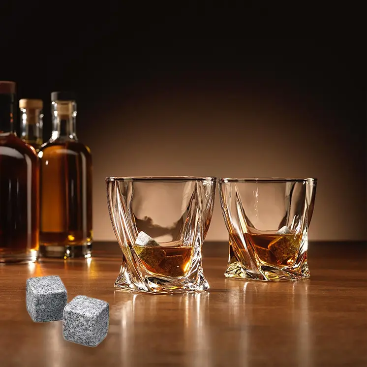 Ove stilske čaše mogu se pohvaliti jedinstvenim uvijenim dizajnom koji ne samo da izgleda šik, već pruža i sigurno držanje, osiguravajući uživanje u svakom gutljaju sa poverenjem. Besprekorno uparene sa ledenim kamenim kockama za višekratnu upotrebu, vaša pića ostaju hladna bez brige o razblaživanju, što ih čini idealnim za sve, od intimnih trenutaka uz viski do živahnih koktel zabava.
