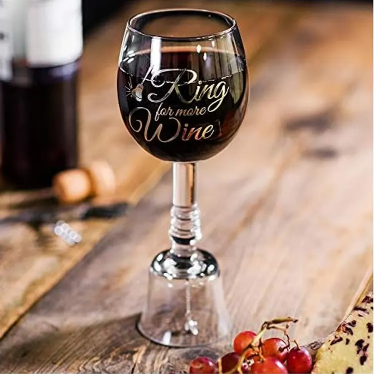 Vinska Čaša sa Zvonom koja jasno kaže Ring for more Wine, bre ili ti na srpskom, Zvoni za Još Vina, bre! Da li vam se ikada dogodilo da vam čaša ostane prazna, a vi ste previše opušteni da je napunite? Vreme je da to rešite sa stilom! Predstavljamo vam vinsku čašu sa zvoncetom i natpisom "Ring for More Wine". Ova čaša nije samo pribor za vaše omiljeno piće, ona je moćan alat za osiguranje konstantnog dotoka tečnosti.