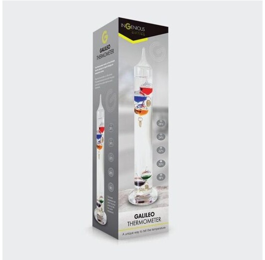 Termometar Galileo Veliki u čast jendog od najvećih mozgova ikada. Da li je neophodno objašnjavati zašto Galileo? Da li je neophodno napisati koju reč...pardon, koji sastav o čoveku...pardon, natčoveku. Nadam se da nije. No, da nastavimo dalje sa proizvodom. Termometar tj.toplomer, služi za merenje temperature. Ovaj termometar tj.toplomer, napravljen je od stakla i ispunjen je tećnošću. Baziran na ideji mozga nad mozgovima tj. Galileo Galileja. Telo iste težine i veličine kretaće se gore, odnosno dole u zavisnosti od kretanja temperature. Kuglice menjaju visinu u zavisnosti od temperature, gde svaka kuglica na sebi ima zakačen broj. Tako da ako se kreće određena kuglica eto i eureke.Ne rezumete? Pa i njega nisu mnogi kapirali u to doba, a vidim ni ja sebe baš ne kapiram. Možda ću za koju godinu kada mi neko objasni o čemu je ovde reč.