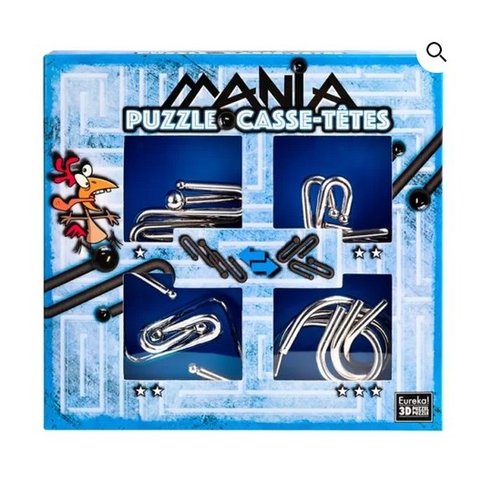 Set Puzzle Mania Blue je set od četiri metalne mozgalice različitih težina. Namenjena su uzrastu +6 godina. Poznajemo genijalce od 5.godina koji su uspeli ovo da reše ali znajte da poznajemo mnogo više njih koji su +20.godina koji i dalje ne mogu sve da ih reše.