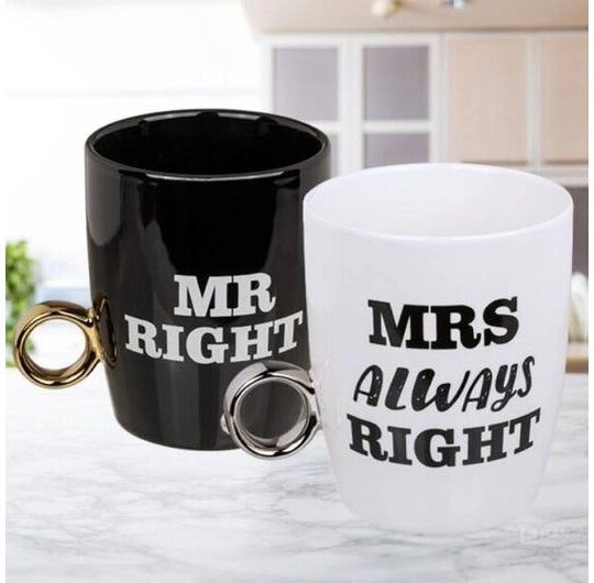 Set Šolja Za Parove gospodin Pravi i gospođa koja je uvek U pravu (Mr. Right Mrs. Always Right) možete pokloniti svakom paru koji je stupio u bračni život kako bi olakšali život gospodinu. Iako je bela rajska boja, crna boja šolje namenjena muškarcu nije slučajna.