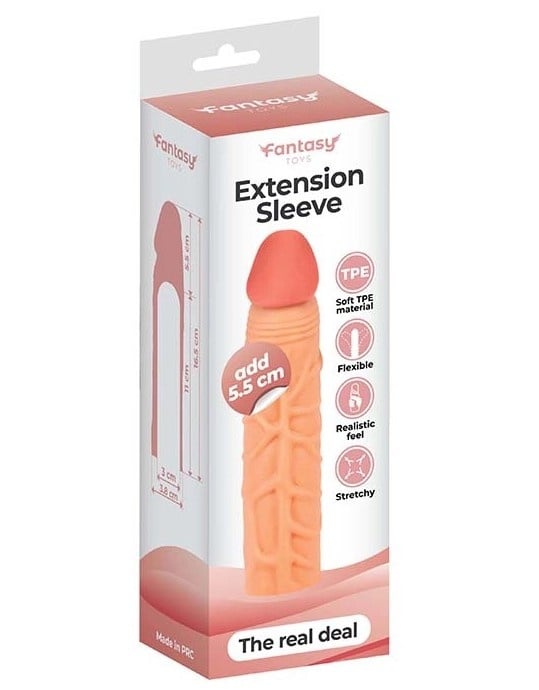 Realistična navlaka za penis | Extension Sleeve je silikonska navlaka za penis dizajnirana je za muškarce koji žele da unaprede intimne trenutke i partnerki pruže dodatno zadovoljstvo. Sa ukupnom dužinom od 16,5 cm i dodatnih 5,5 cm produžetka, ova navlaka stvara osećaj punine i intenzivne stimulacije.