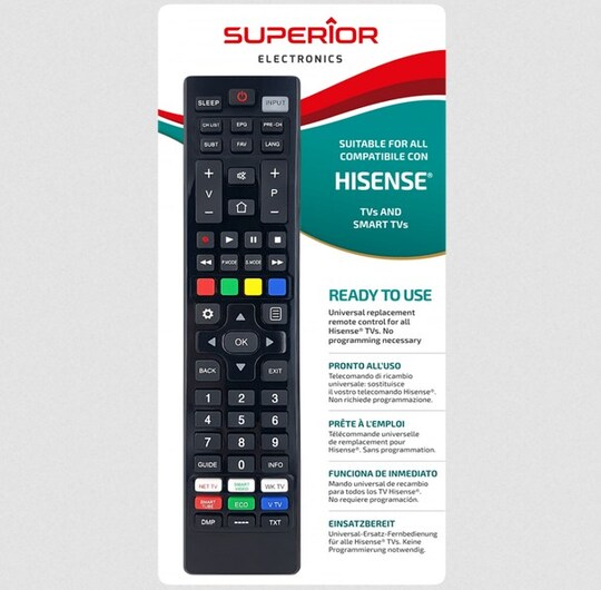 Univerzalni daljinski upravljač sa već predefinisanim kodovima za sve Hisense televizore proizvedene posle 2000. godine. Uključuje sve funkcije, standardne i napredne, plus sva dugmad originalnog daljinskog upravljača. Dugmad su velika i meka na dodir.