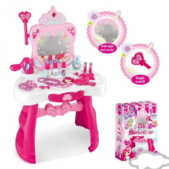 Kozmetički sto sa ogledalom 67 x 44 x 28 cm. Delovi kompleta sa svetlosnim i zvučnim efektima - (21 deo). Potrebne baterije 3xAA - nisu uključene. Namenjen za uzrast 3+.
