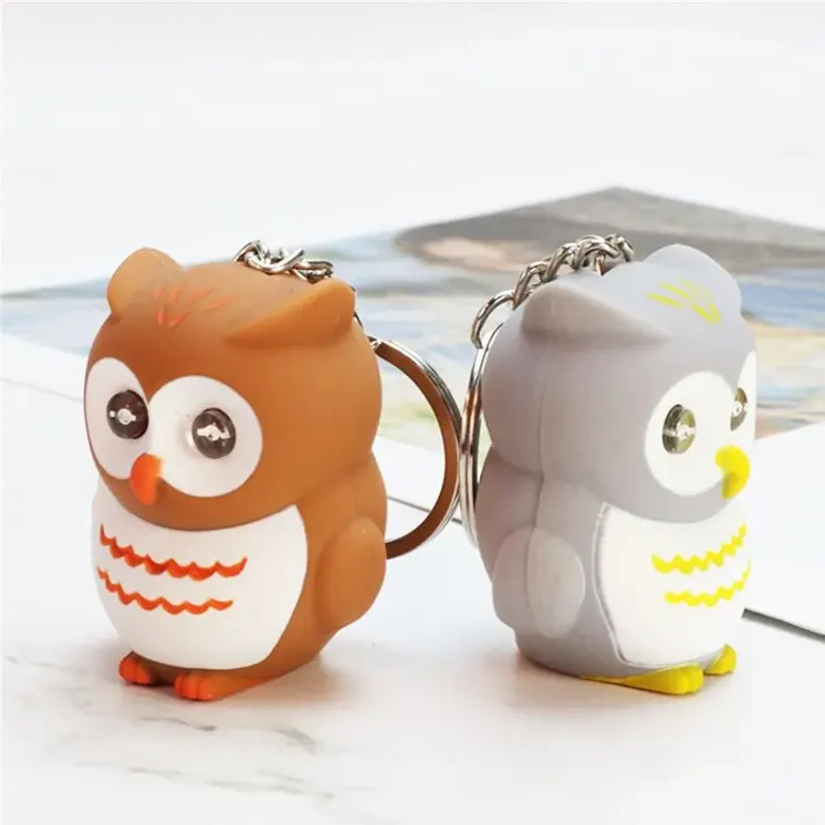 Privezak Sova svetli pritiskom na dugme. Dolazi u dve različite boje, sivoj i braon boji.