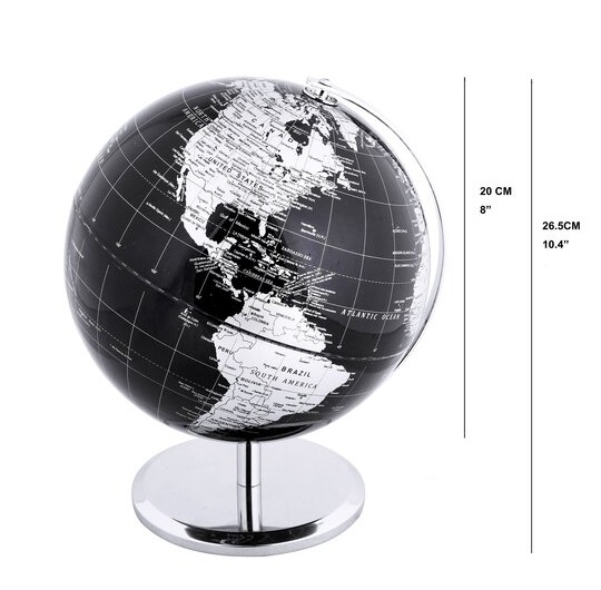 Globus Metalik Crni je više od ukrasa. Savremen globus modernog izgleda sa veoma stabilnom bazom, savršen za dekoraciju kuće ili kancelarije. Sam proizvod se okreće na čvrstom postolju. U pitanju je globus impresivnih detalja, prečnika 20 cm, sa veoma kvalitetnom i detaljnom štampom i jasnim oznakama, ucrtanim državama, političkim granicama, glavnim gradovima i još mnogo toga.