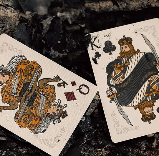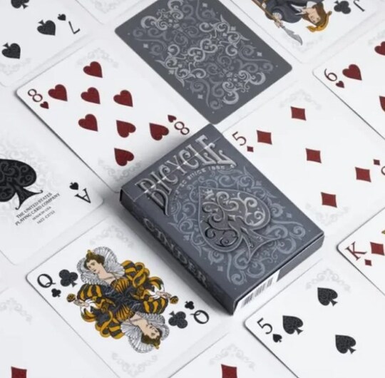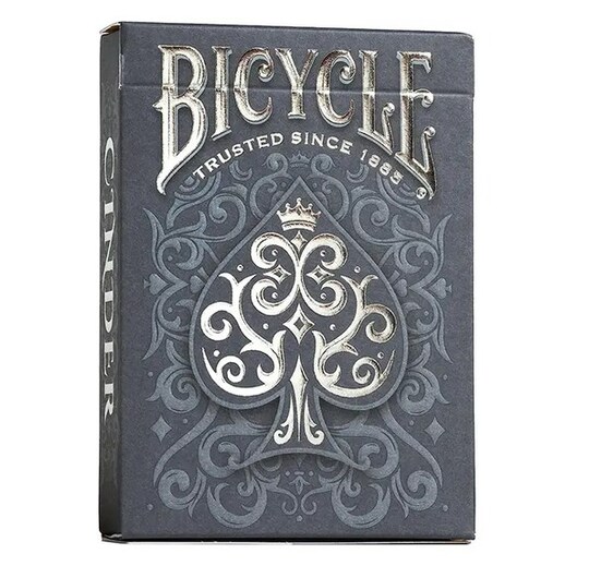 Bicycle Cinder karte su inspirisane elegantnim i misterioznim uskovitlanim dimom koji se vijuga iznad tinjajućih vatri. Dizajn predstavlja različite tonove pepeljasto sivih tragova dima na predivnoj srebrnoj foliji koja krasi kutiju špila, sa dva nivoa utiskivanja kako bi se obezbedio 3-D efekat.