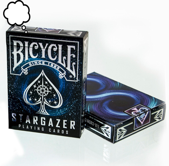 Bicycle Stargazer karte su inspirisane oblacima i dešavanjima oko crne rupe. Bicycle Stargazer ilustrovane zvezdama i drugim misterioznim svemirskim objektima. Ukoliko ste ljubitelj kosmosa onda su ovo prave karte za Vas. Inspiracija za poleđinu karata čine oblaci oko crne rupe koji poprimaju oblik same crne rupe. Klasičan Air Cushion finish kao i ceo špil, štampan je u Sjedinjenim Američkim Državama.