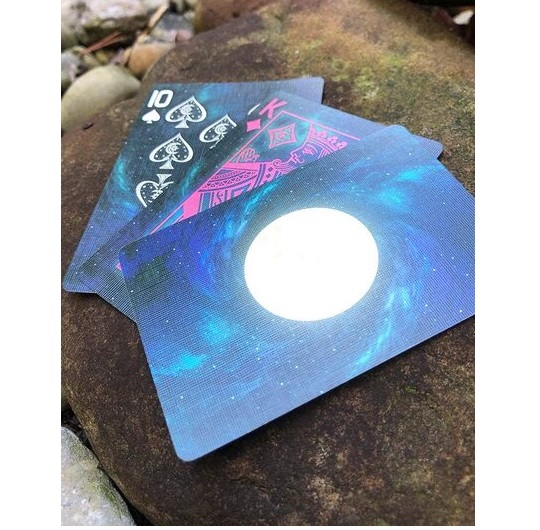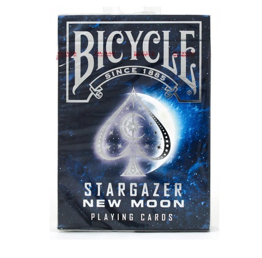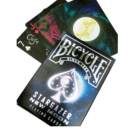 Stargazer New Moon karte su inspirisane oblacima i dešavanjima oko crne rupe. New Moon su ilustrovane zvezdama i drugim misterioznim svemirskim objektima. Ukoliko ste ljubitelj kosmosa onda su ovo prave karte za Vas. Inspiracija za poleđinu karata čine oblaci oko crne rupe koji poprimaju oblik same crne rupe. Klasičan Air Cushion finish kao i ceo špil, štampan je u Sjedinjenim Američkim Državama.