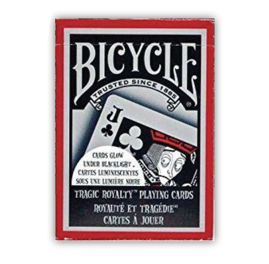 Najkraće rečeno za karte Bicycle Tragic Royalty je da su to karte koje svetle u mraku. Kao što možete videti u našem podnaslovu ovo su karte koje svetle u mraku. Vratićemo se na to. Samo da napišemo da su karte kreirane sa unikatnom crno-crvenom poleđinom gde se kečevi susreću sa paukovom mrežom. Najveće iznenađenje kod ovih karata je što svetle u mraku ali pod uslovom da se koristi uv svetlo. Zamislite kako bi mogla izgledati vaša sledeća igra noću. Karte su idealne za sve mađioničare, decu i one koji vole da igraju karte noću.